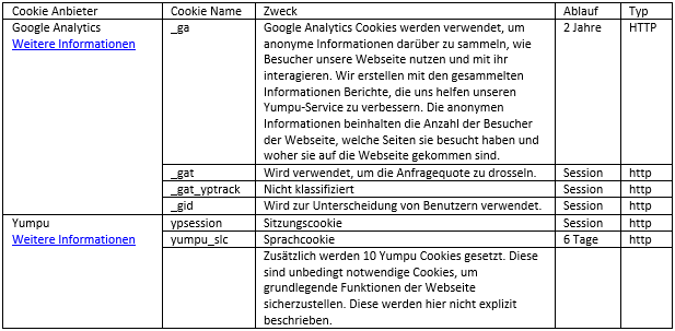 Durch bestimmte von uns genutzte Dienste können weitere Cookies gesetzt werden. Mehr dazu unter "Google Analytics" und "Yumpu".